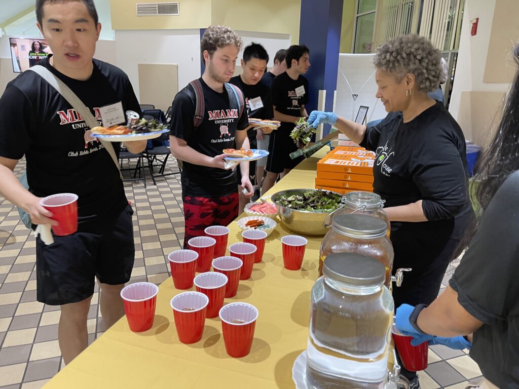 At lunchtime, the Maple Room in the Rec Center was bubbling with laughter and conversations, providing an opportunity for students to “blend” with each other along with Juice House members. Lunch was served by Juice House’s community and student members and featured pizza, salad, cookies and iced tea. The meal was provided by Juice House with contributions from Dr. Sammy Spann, VP for Student Affairs, on behalf of UToledo.