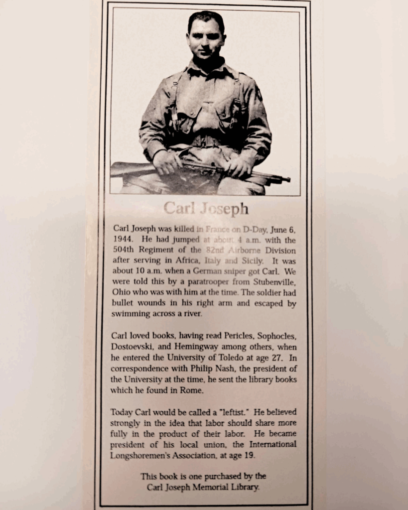 While deployed, Joseph would unfortunately pass away on the eve of D-Day after parachuting behind enemy lines; he was only 27. However, his legacy at the University of Toledo began even before the library collection in his honor was created. Joseph was an avid reader and consumer of knowledge, so while deployed, he sent books he bought in Europe back to the University of Toledo as donations. These books are separate from the Carl Joseph Memorial Library collection and are housed on the fifth floor of the Carlson Library in Ward M. Canaday Center’s rare books room.