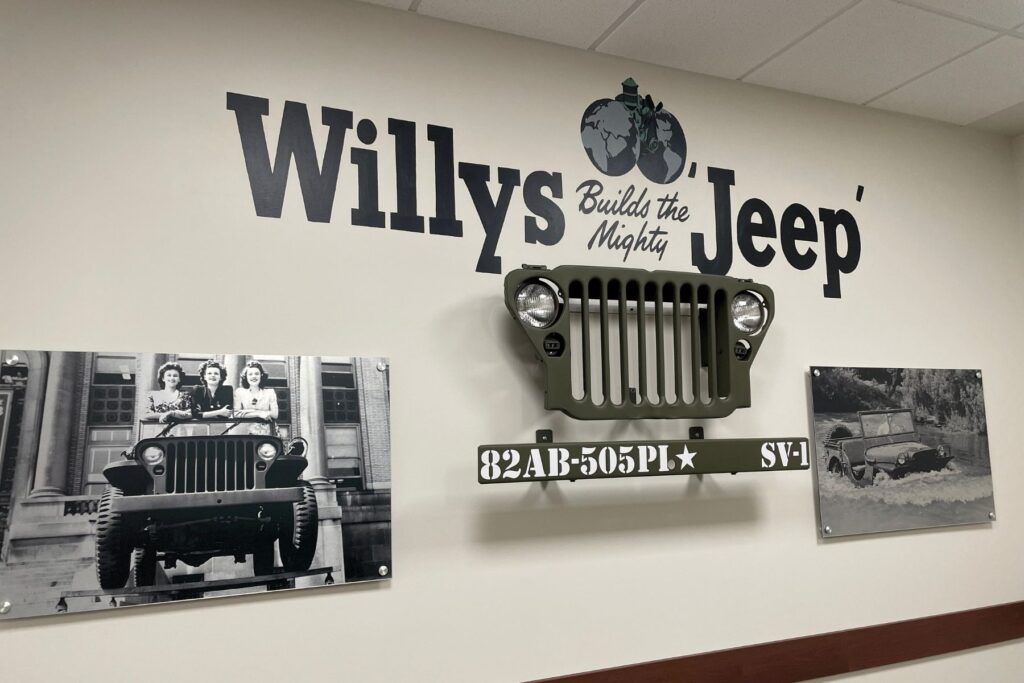 “I have read through the letters, and when I built those spaces like the Auto-Lite room or the World War II space, I would refer back to those letters and try to learn what I could to help build those areas,” Remaklus said. “So [the Auto-Lite strike] area was built because he was arrested in that strike, and that was an important part of his life. The World War II one was for obvious reasons, but we focused in that space on women in the workforce, so you’ll see a lot of Rosie the Riveter in there. And then that World War II Jeep that I have mounted on the wall back there, I looked up what Carl Joseph’s unit number was, and that’s what’s painted on the bumper of that Jeep.”