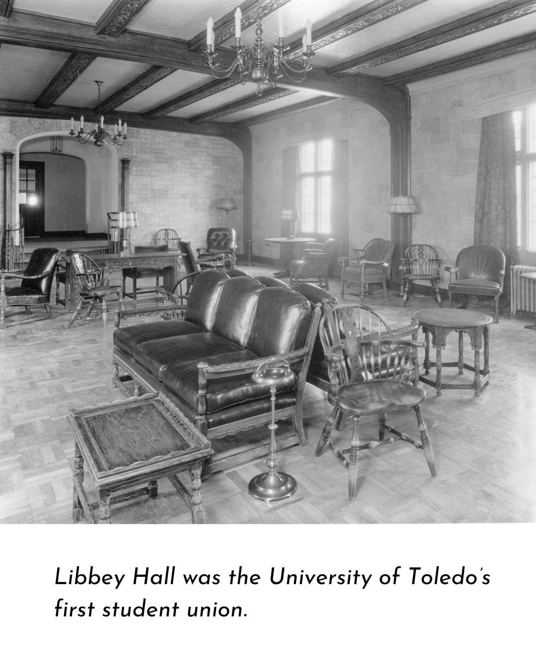 Libbey Hall was used as the University of Toledo’s first student union, and also held a dormitory on its top floors. Its function changed with the creation of the Lancelot Thompson Student Union in 1959, and today Libbey Hall houses the Office of Undergraduate Admission.